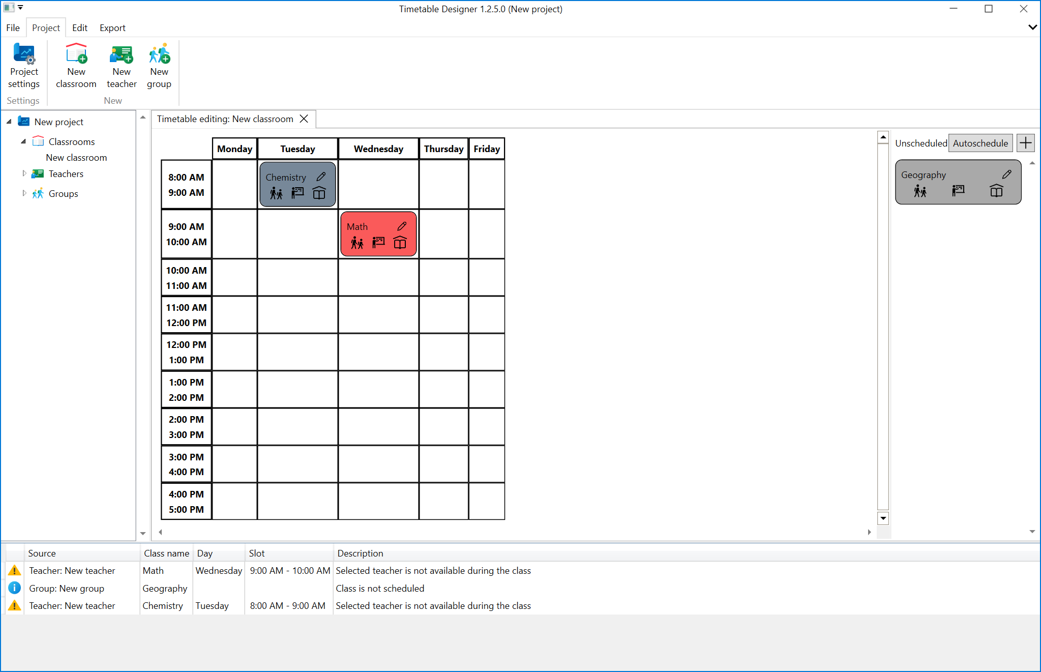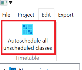 To add a new class, click the "+" button in the "Unscheduled" list. A new class will appear in the list. You can edit it by clicking the pencil icon. You can clone a lesson by clicking the copy button. You can delete a lesson by clicking the trash can icon. You can add and remove classes from the schedule by dragging tiles between the "Unscheduled" list and the schedule table. You can automatically add unscheduled classes to the schedule using the "Autoschedule" button (only those assigned to the currently edited entity) or using the main menu option available in the "Edit" tab.