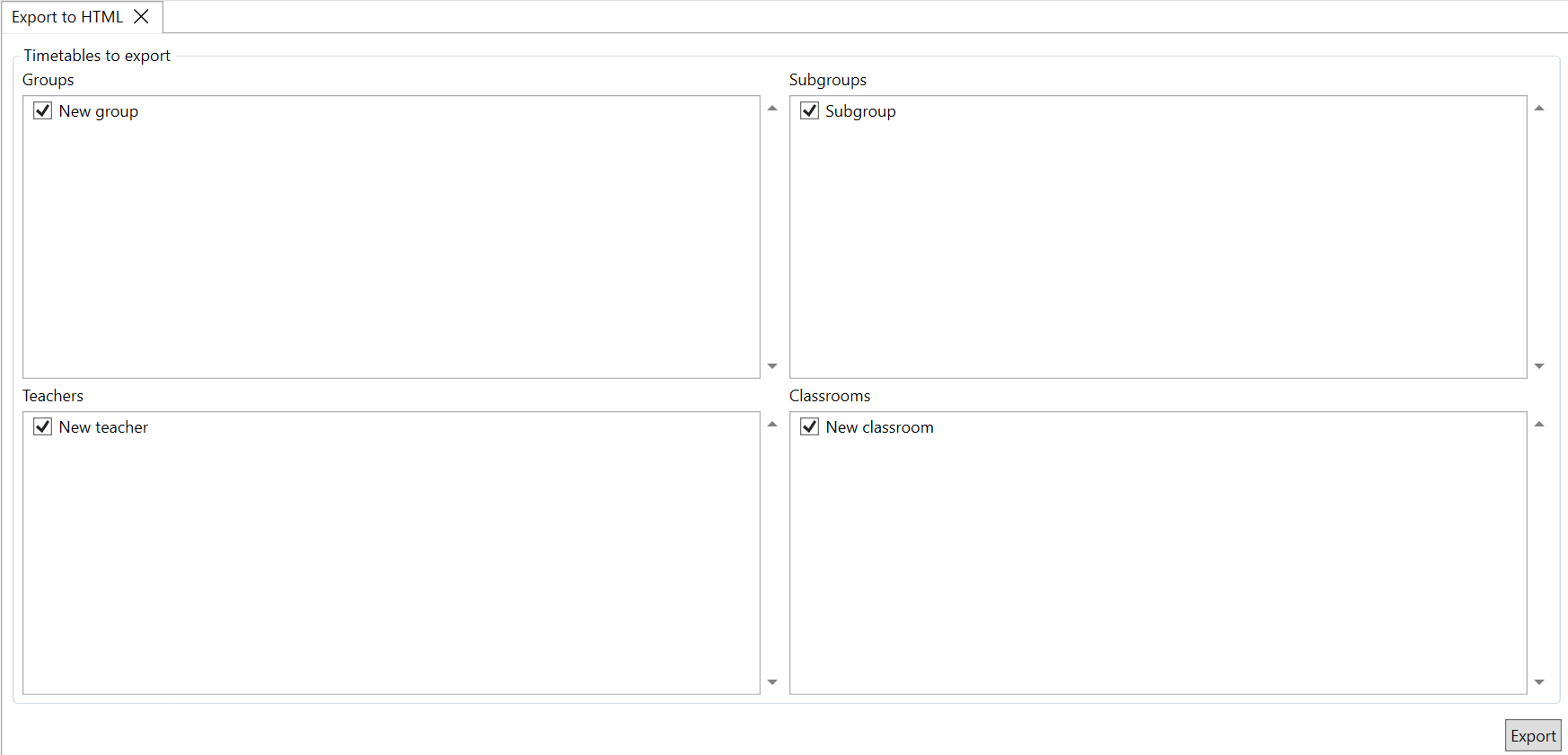 A new tab will open with the export settings. You can select groups, subgroups, teachers, and classrooms for which the timetable will be exported. To export the schedule, click the "Export" button and then select the file location.